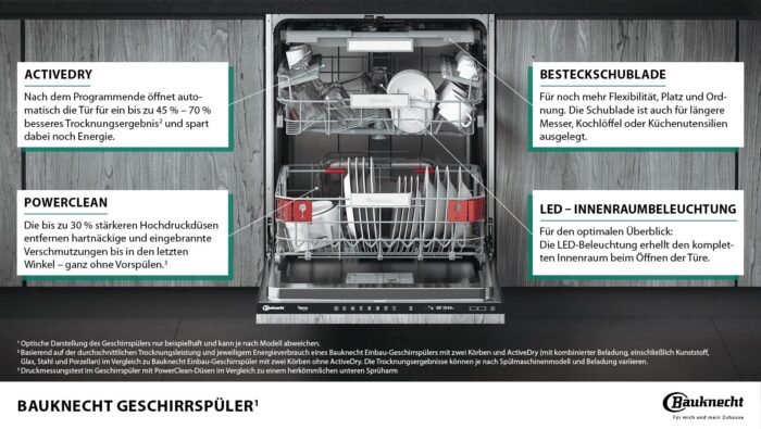 • INNENRAUMBELEUCHTUNG – Für den optimalen Überblick Die innovative LED-Beleuchtung leuchtet den Innenraum Ihres Geschirrspülers beim Öffnen der Türe ideal aus. Somit überzeugen die Bauknecht Geschirrspüler durch einen besseren Überblick beim Beladen und punkten zudem mit ansprechender Ästhetik.