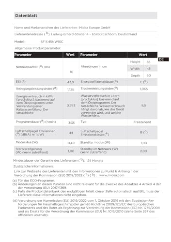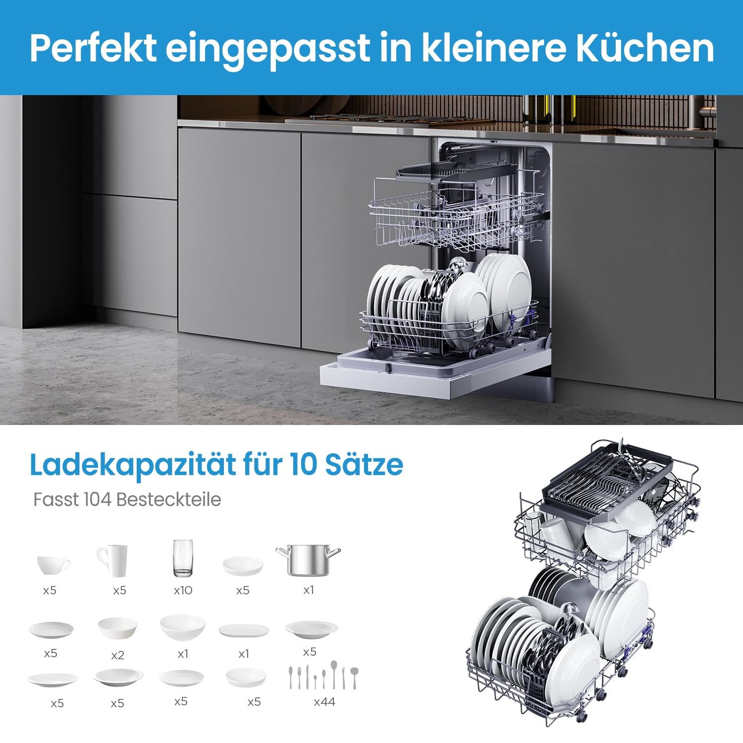 Einzelheiten: 10 Einstellungen, Halbe Beladung, Kindersicherung, 5+2 Programme, GoldeneHygiene, 44 dB, 1-24H Verzögerung, Verstellbare Körbe